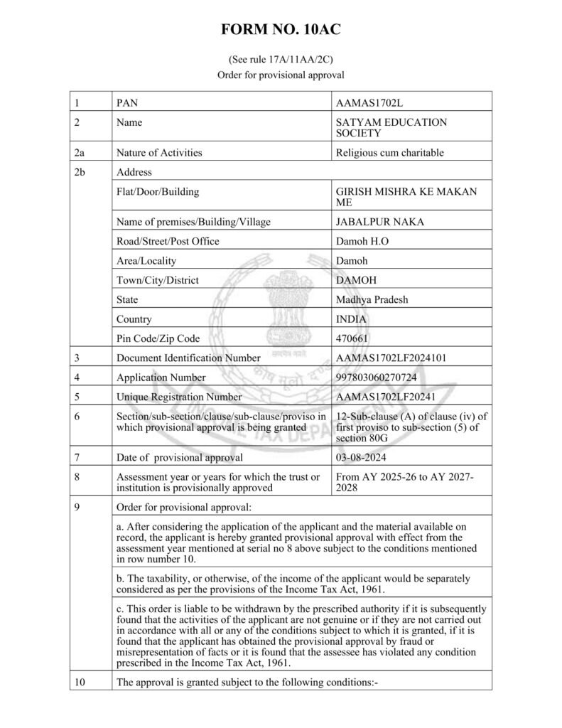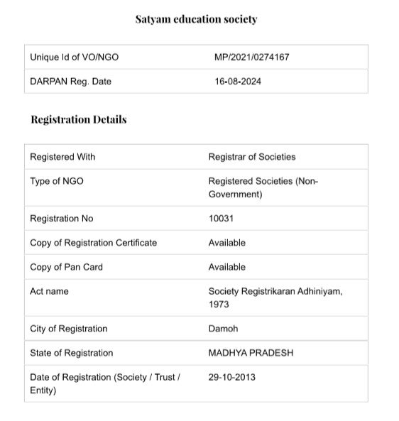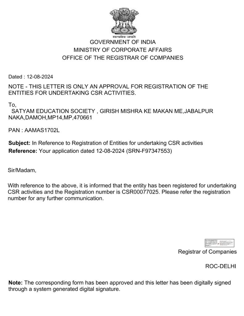 Registration / Recognition Registration / Recognition Satyam Education is a registered and recognized institution committed to delivering quality education and adhering to all regulatory standards. Our certifications are nationally recognized, ensuring trust, credibility, and value for every learner.” CSR CERITIFICATE 80 G 12A Registration PAN Code NGO darpan NITI AYOG CERITIFICATE